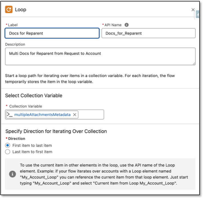 2. Now users get all uploaded file in the Flow in a list with the following parameters in multipleAttachmentsMetadata variable: