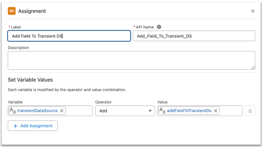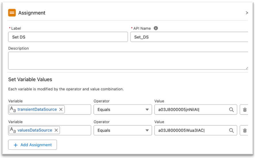 - The valuesDataSource flow variable will store the Data Source Id we created before (see, paragraph I step 2 – create Data Source of SOQL type).
