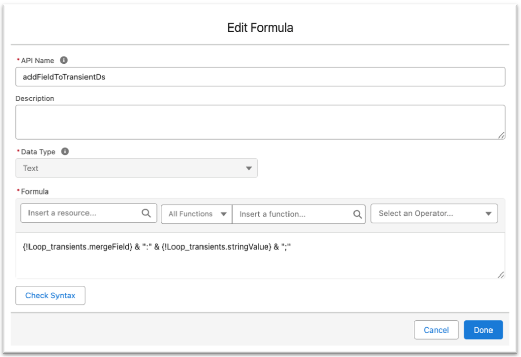 Here addFieldstoTransientDs is a Formula that does simple concatenation: