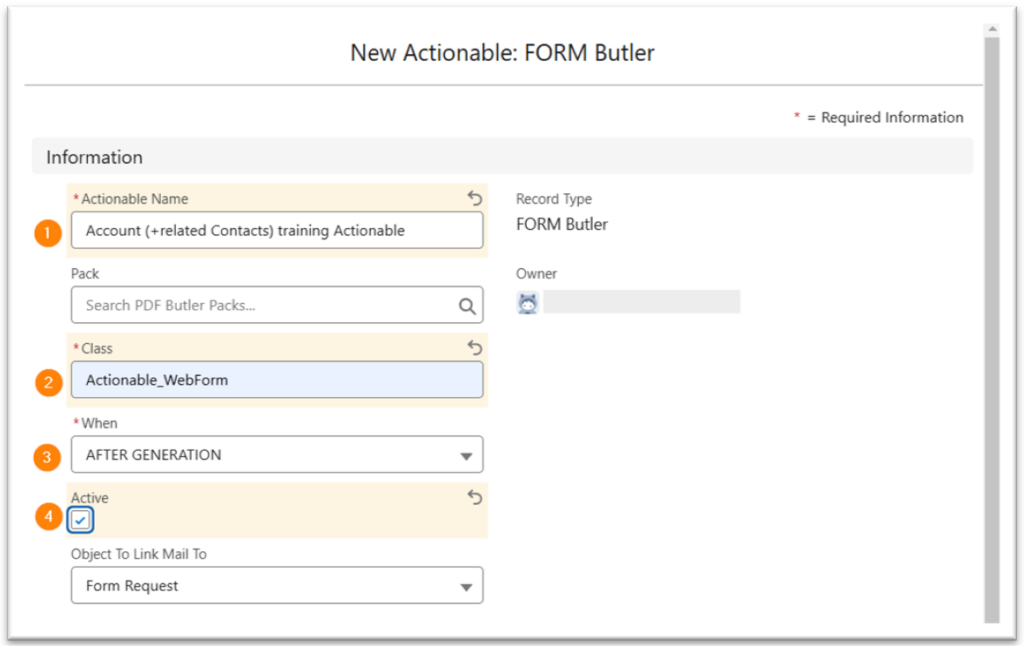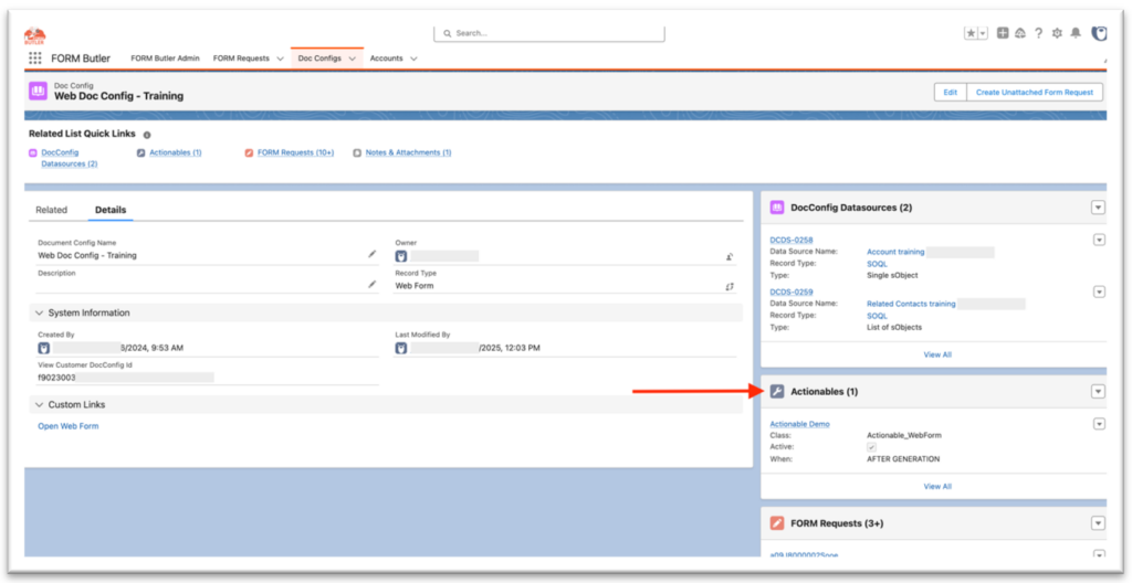 - (2) Form Doc Config: Select the Doc Config to wich creates Actionable (Account (+related Contacts) training in this case).