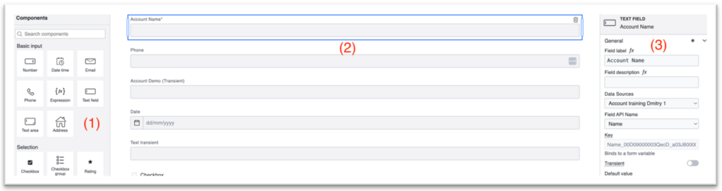 - Dynamic Field configuration. When you click on a dynamic Field on the Builder page (2), for example “Account Name”, the properties panel (3) displays the form field properties Admins can set for the component. Let’s check some of the properties: