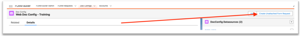 - Unattached or generic FR – create requests with Never Expired Document Action field value that allows to use link for insert records as many times as needed. From the Doc Config page click “Create Unattached Form Request” button