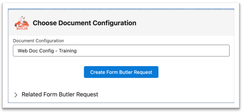 In our example, we locate this component on the Account Record Page in Salesforce. Then Admins can select a Doc Config and click “Create Form Butler Request” button to generate a Form Request.