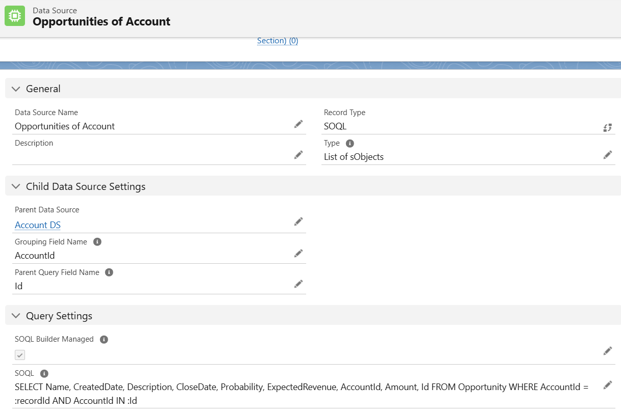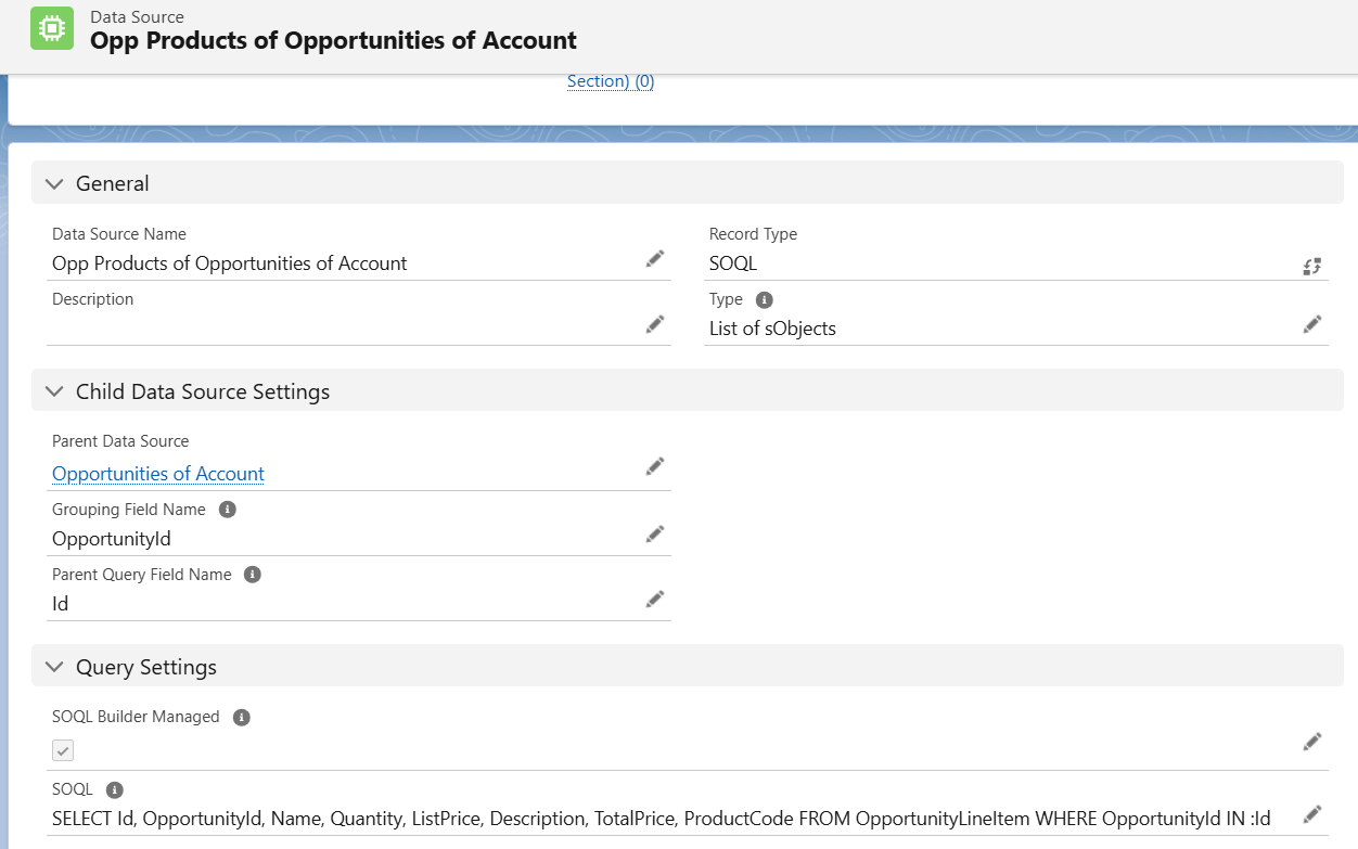 Create below DataSources to fetch the Account, related Opportunities and related Opportunity product fields as shown below.