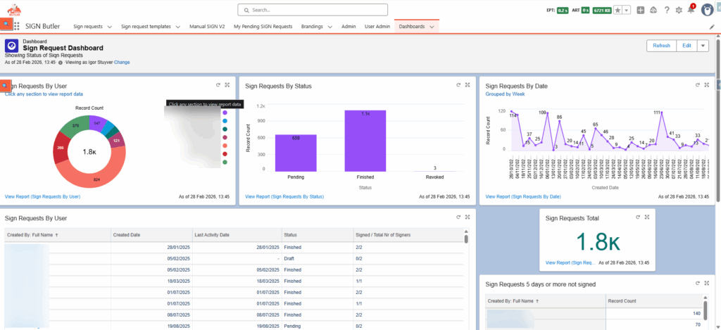 You can install the SIGN Butler Dashboard and Reports package: SIGN Butler Dashboards v1.3