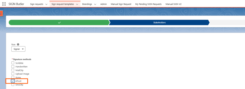 - Create a SIGN Request Template with a signer that uses Sign method “aTrust”