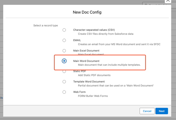 The Doc Config should have the ‘Main Word Document’ record type.