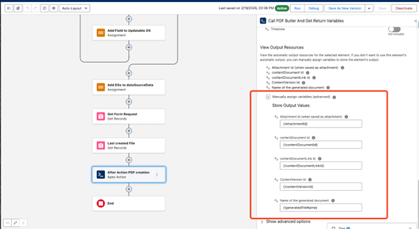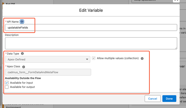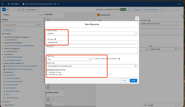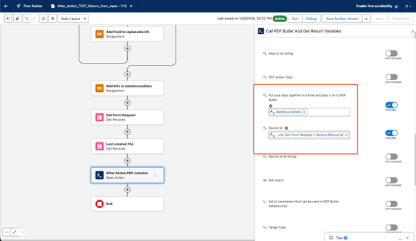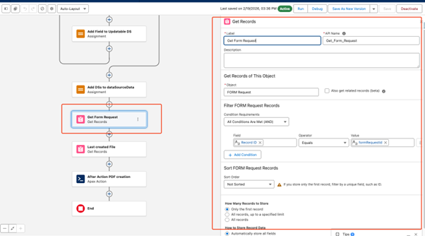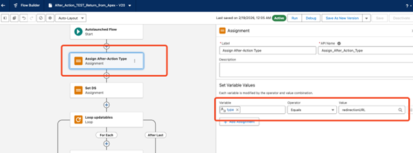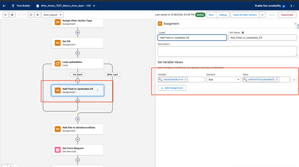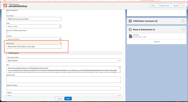 Once the Unattached Form is created, enter the API name of the Flow in the ‘After Action’ field on the Form Request