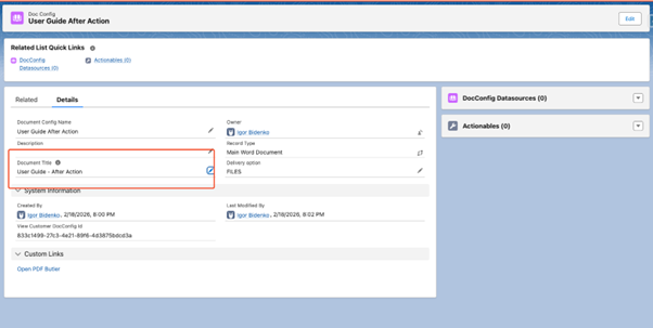 In the created Doc Config, enter the document title. It will be the name of the generated document.