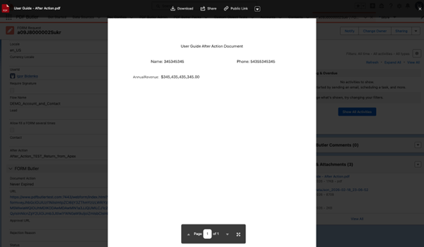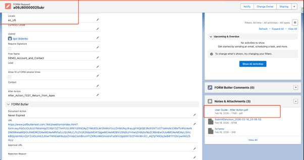 Note: If you use the Redirection URL or Message type, after submitting the form, the file will be attached to the Form Request (if it is an Unattached Form) or to the Account (if it is an Attached Form).