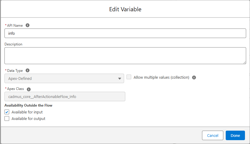 - Apex Class “cadmus_core__AfterActionableFlow_Info”
